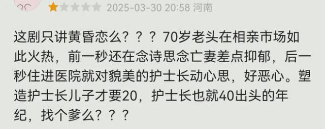 因此,在《我的余生》中,老沈在妻子相知相惜半生后,立即看到了年轻的护士长,并迅速同居,这不仅让剧中的沈青和沈黛兄弟姐妹难以接受,也让刘丽娜对家人不屑一顾,甚至让很多观众摆头甚至鄙视。