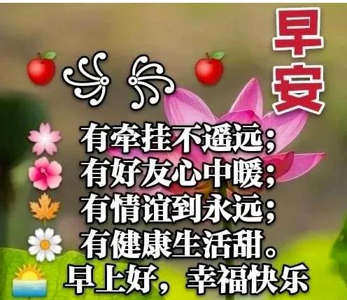 生活就像彩虹,有红有绿有蓝;生活就像海洋,有波澜;苦难和挑战是我们成长的基石;微笑和力量是我们追求幸福的源泉。祝你每天微笑面对,勇往直前,享受生活的美好。早上好!