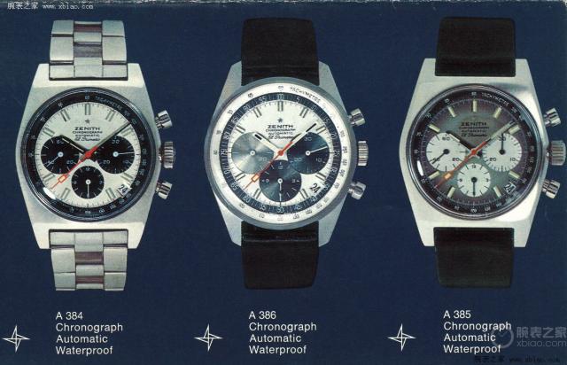 El Primero 起源于西班牙语“第一”的意思,突出了作为第一个高振频自动计时机芯的地位。El Primero 第一代机芯型号 3019 PHC 直径 30 mm、薄厚 6.5 mm。采用导柱轮结构,由于摆陀外原因碳化钨制成。为了应对高振频产生的零件损坏,El Primero 第一次使用盐酸钼作为机芯(Molybdenum Sulfate)用作润滑油。搭载 El Primero 机芯的 A384、A385、A386 手表于 1969 年度发布,共同构成真力时自动计时表“三部曲”。近几年,这些经典型号都被复制了。