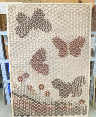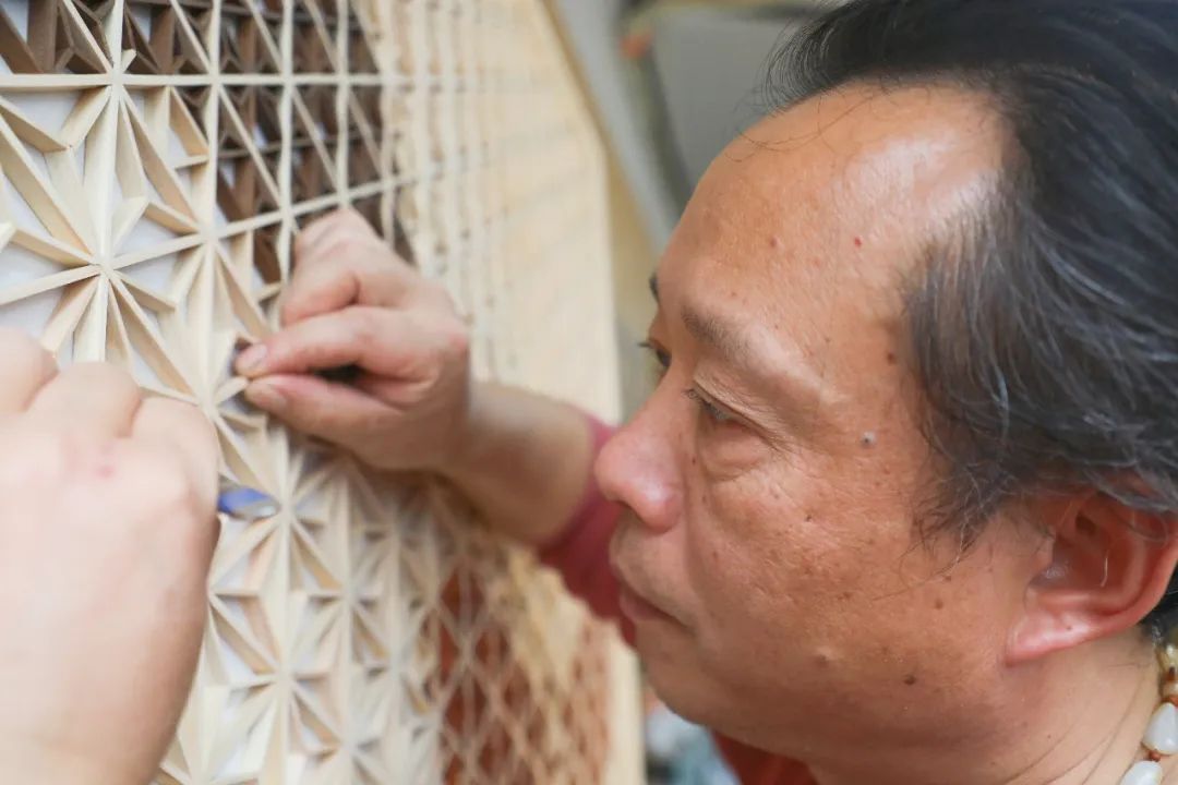 更令人惊讶的是,窗棂图案中丰富多彩的颜色不是来自颜料的涂抹,而是来自桑树、柏树、青金丝楠、绿金丝楠等不同木材的颜色。周文祥结合几何三角原理,采用三材交叉榫、卡扣榫、直材交叉榫等榫卯技术,将这些木材形成千变万化的图案。只有一只蝴蝶使用了4000多个零件,所有木材的开头和结尾可以连接到1000米。