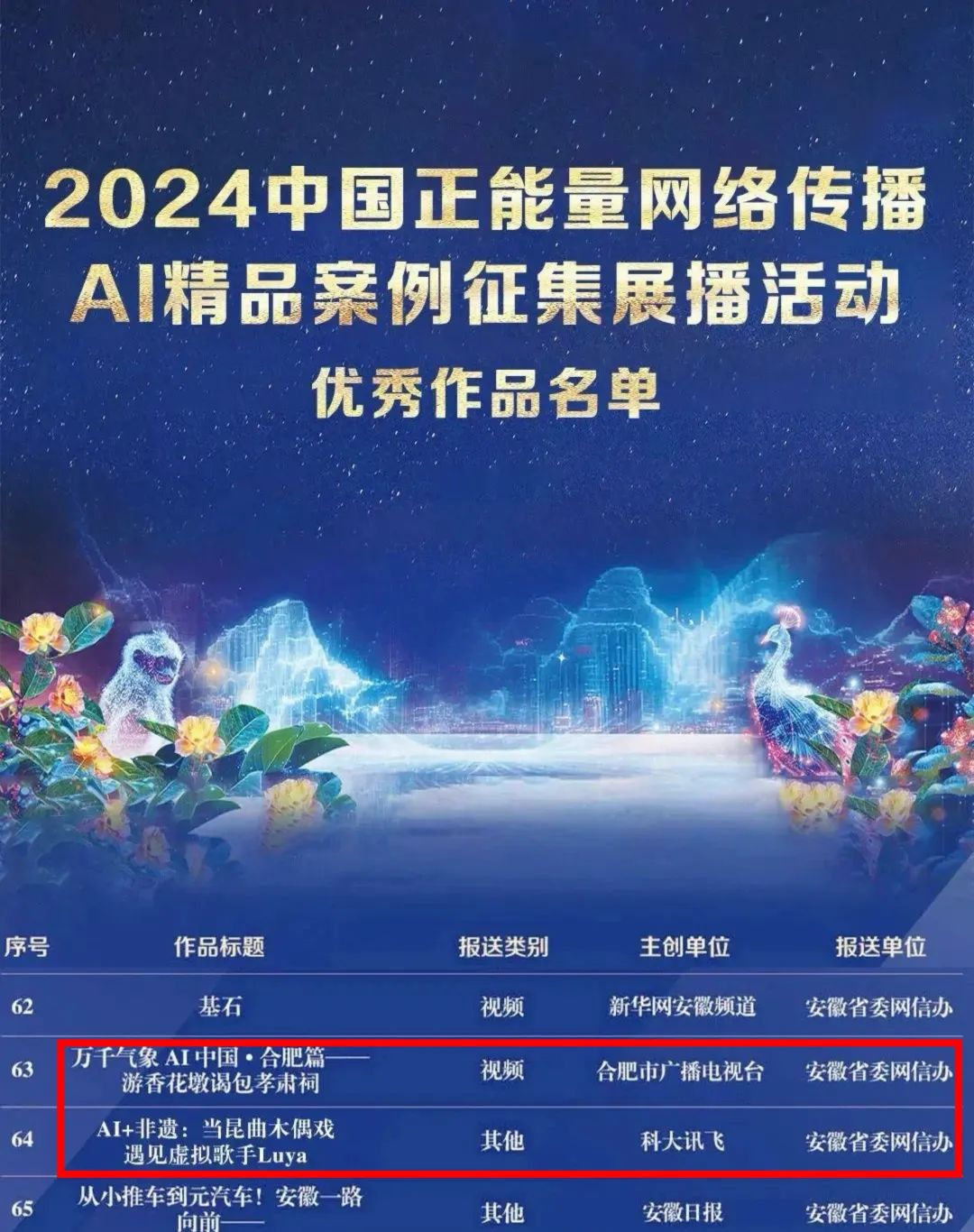 通过独特的X-Vocal音质创作、AI变音&音乐生成,讯飞音乐,Smart-tts演讲生成、AI词曲和原画生成、AI驱动动作和表情等技术,全方位打造和包装了AI虚拟歌手Luya。科大讯飞以科技力量激发全体员工的非遗传传承活力,让非遗产在新时代焕发生机,让更广泛的人看到非遗产,听到非遗产,传播非遗产。