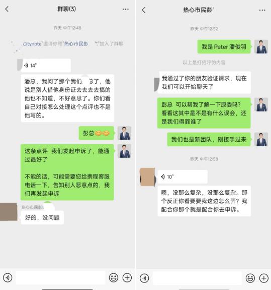 知道这件事后,希诺的一位高管把潘俊羽和彭某拉进了一次群聊,说:“是别人借他的身份证做的。他不知道。对不起,你可以自己联系,看看怎么处理这个评价。这不是他写的。”