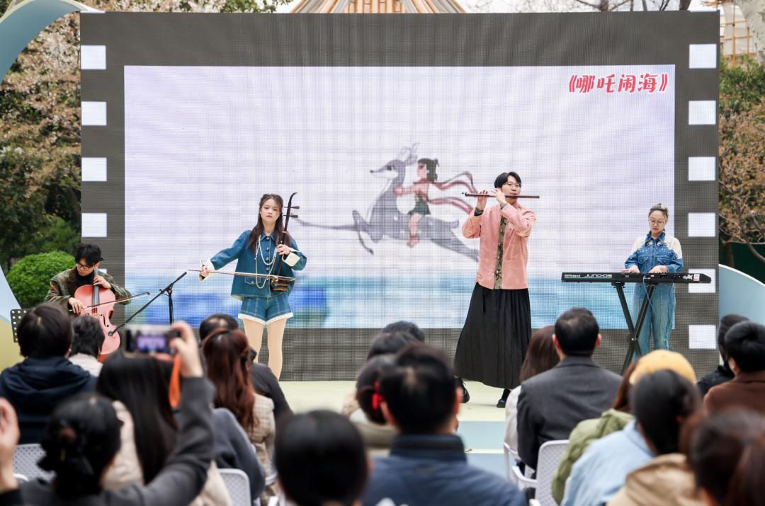 春天的襄阳公园里到处都是鲜花。在公园广场上,几十张记录上海电影历史的电影海报吸引了许多观众。听一段电影音乐,了解音乐对电影的意义和作用;阿卡贝拉电影歌曲的串烧让观众在几秒钟内回归光影世界,重温当时的记忆;从《天宫大闹》到《白蛇:起源》,精彩的器乐表演生动地展现了动画电影音乐的技术演变。