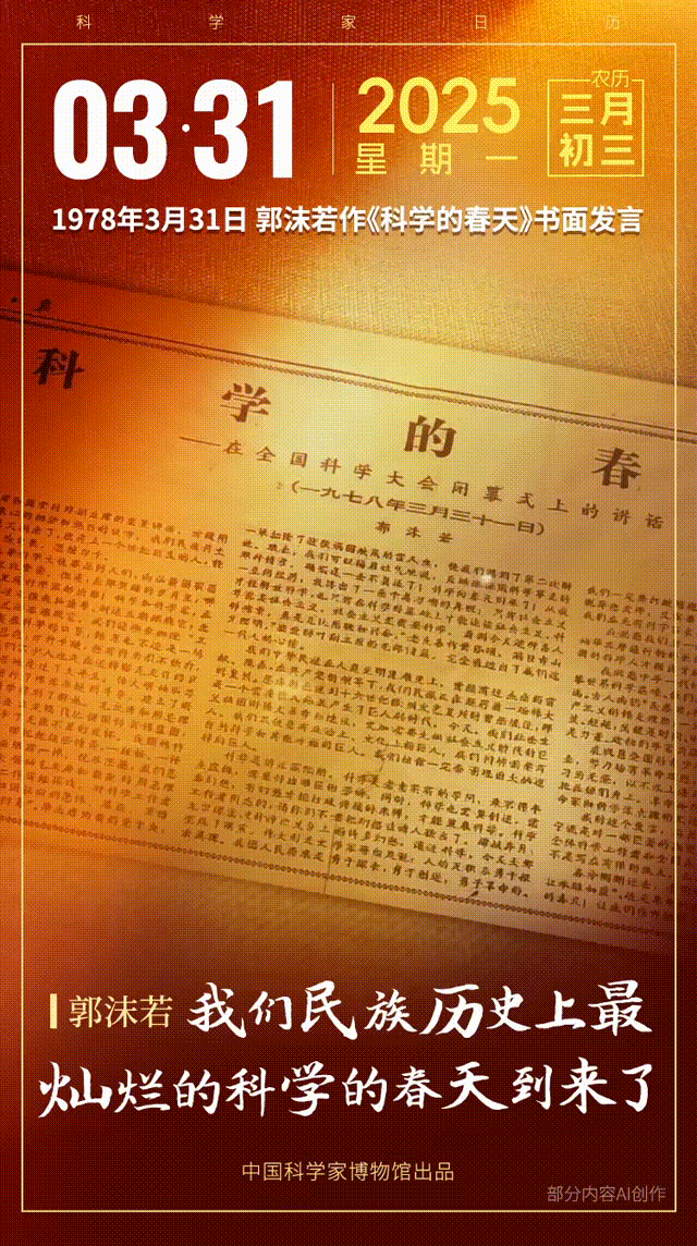 一九七八年三月三十一日,全国科学大会在北京闭幕。有6000名代表,盛况空前。会议闭幕式上,主播宣读了当前中国科学院院长郭沫若的书面演讲《科学的春天》。演讲用澎湃抒情的语言向广大科学家寄予期待:中华民族一直具有非凡的创造力,期待所有科学家与全国人民携手共进,在无边无际的宇宙中写出一部震撼人心、意义重大的作品。 “巨着” 。