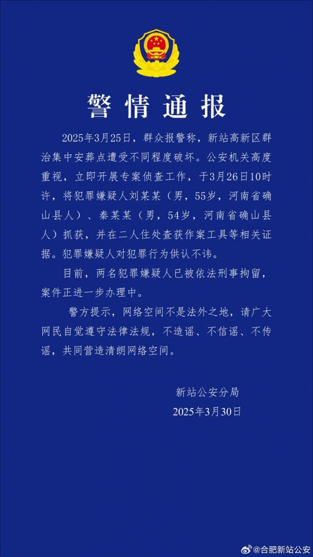 近日,合肥新站一处墓地内多处墓碑被砸碎,骨灰被恶意抛洒。3 月 30 日,合肥新站公安局发布通知:2025 年 3 月 25 日本,群众报警称,新站高新区群治集中埋葬点受到不同程度的破坏。公安部门高度重视, 3 月 26 日 10 时许,将犯罪嫌疑人刘某某 ( 男,55 河南省确山县人岁 ) 、秦某某 ( 男,54 河南省确山县人岁 ) 逮捕,并在二人住所查获作案工具等有效证据。嫌疑人对犯罪行为供认不讳。当前,两名犯罪嫌疑人已被依法刑事拘留,案件正在进一步处理中。