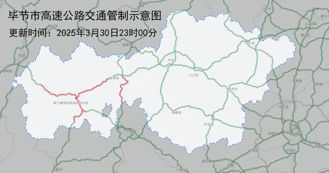 由于受到低温大雾天气的影响,不具备安全通行条件,经高速公路“一路三方”共同会商决定,3月30日23时00分,临时交通管制从毕威高速赫章(K54)到威宁北(K112)段双向、都香高速金钟(K396)到K474段双向、威围高速金钟(K124)到金斗(K143)段双向、赫六高速赫章南(K33)到野鸡街(K72)段。