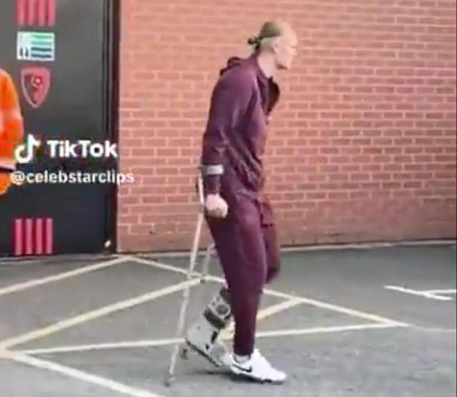 经过队医的治疗,哈兰德没有好转,只好早点离开。比赛结束后,一些球迷拍下了哈兰德拄着拐杖离开球场的照片。挪威人的左腿也换上了特殊的保护靴,看起来很伤人。在接下来的一段时间里,哈兰德可能无法上场。