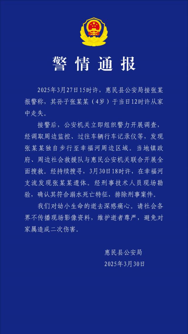 当晚,惠民县警方对此事发出警报,通报称,张某希系溺水死亡,排除刑事案件。而且我对年轻生命的逝去感到非常难过。请不要传播现场视频资料,维护死者尊严,避免对家属造成二次伤害。通知内容如下。" 2025 年 3 月 27 日 15 时许,惠民县公安局接到张某的报警,称其孙子张某某。 ( 4 岁 ) 于当日 12 时许迷失在家里。