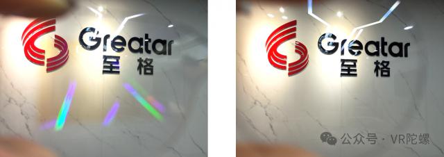 因此,格尔科技开发了“无彩虹图案”专利技术,引导彩虹图案通过独特的光学系统传播到特定的视角,防止进入人眼。这个方案可以保证用户在 95% 没有一个场景能感觉到彩虹纹的出现。