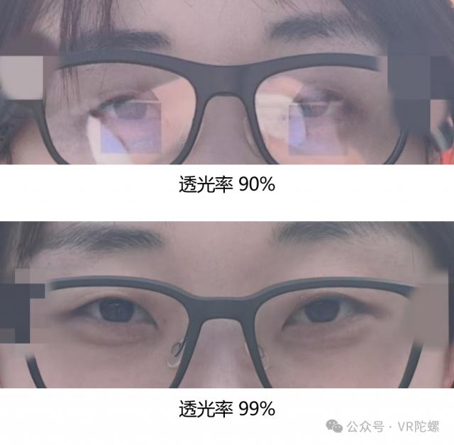 对普通眼镜而言,透光是一个重要指标,它不仅直接影响视觉清晰度、佩戴舒适度,而且影响对不同环境的适应性。例如达到透光度 99% 左右镜片,可以使广大光源进入眼睛,使视物更加明亮清晰,色彩恢复更加准确。而且透光率低的镜片,视物会偏暗,影响视觉享受和对物体细节的区分。对于 AR 对于眼镜来说,低透光率也意味着高反射率,这使得对面的人经常可以看到佩戴者眼镜的反射,而看不到佩戴者的眼睛,这使得佩戴者看起来非常奇怪。而且高透光率 AR 眼镜也不会有这种尴尬的问题。