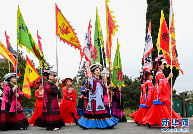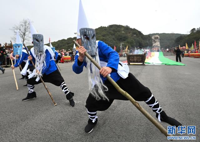 △ 3 月 28 日本,贵州省毕节市百里杜鹃管理区祭花神活动上表演的彝族古戏“撮泰吉”。新华网(李华摄)