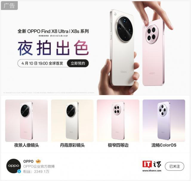 IT 世家 3 月 31 日消息,OPPO Find X8 这个系列的手机将会到来 4 月 10 每天发布,新机已经开始预热:X8 Ultra 将搭载骁龙 8 至尊版芯片,X8s 确定全球首发天玑 9400 Cpu。