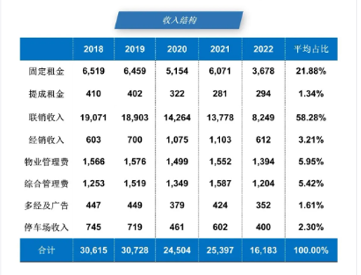 这家商场的租金收入中“联销收入”接近60%,而底租(即图中的“固定收入”)只有20%以上。一方面说明其营业额不错,但由于是合资企业,对运营商的要求更高,业态调整和品牌水平对市场形势的响应要求更高,否则这类租金收入会下降。