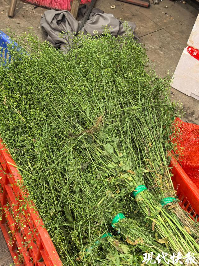 “这怎么卖?”""三元两把,新鲜。"早晨,记者在秦淮区三七八巷周围看到,荠菜花是每个摊位的标配,价格最低三元两把,来问的人不少。一位农民在双塘路周围提着分装的荠菜花摆在菜店门口。居住在玉带园的居民张女士看了看,买了一把带回家。她对记者说:“这是老南京人的传统,买回家洗净,直接放在锅里煮鸡蛋,我家每年都买,可以治疗偏头痛。"