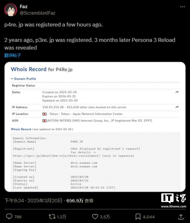 另外,还有消息来源 ScrambledFaz 发觉 Atlus 已注册" p4re.jp "域名,作为比较,Atlus 《女神异闻录》 3 Reload》正式官宣前 3 还悄悄注册了同类域名作为游戏官网。所以很有可能我们最近会听到《女神异闻录》 4:Reload》官方消息。