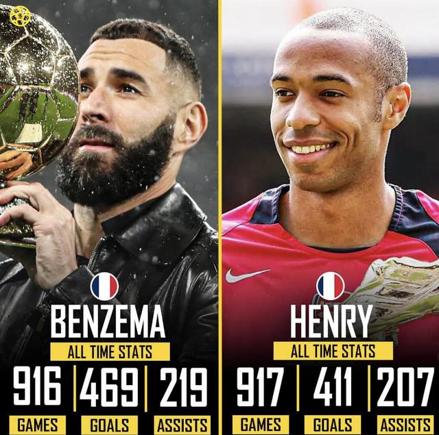 相比之下,本泽马的俱乐部荣誉名列前茅,而亨利则凭借世界杯和欧洲杯的加冕获得了国家队的胜利。