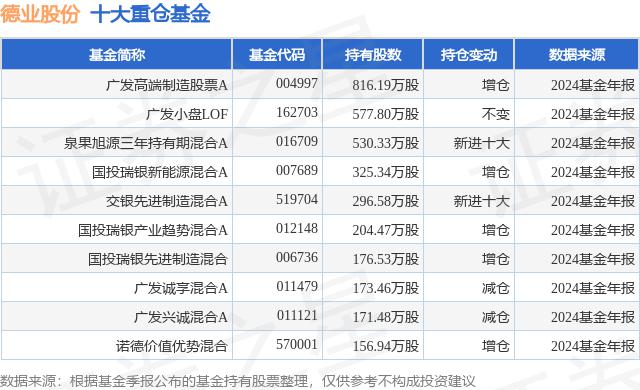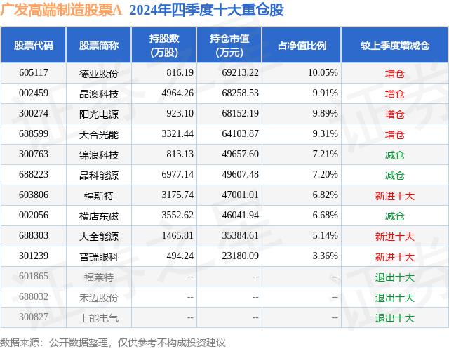 根据 2024 基金年报公募基金重仓股数据,公募基金共同基金重仓股份 124 家庭,其中持有最多的公募基金是广发基金的广发高端制造股。 A。高端制造股票广发 A 目前规模为 61.43 最新净值亿元 1.2624(3 月 28 日期),较前一交易日下跌 最近一年,0.82%下跌 11.97%。公募基金的现任基金经理是郑澄然。在任郑澄然的基金产品包括 : 广发鑫享灵活配置混合配置 A,管理时间为 2020 年 5 月 20 到目前为止,期间收益率为 40.59%;兴诚混合广发 A,管理时间为 2021 年 1 月 6 到目前为止,期间收益率为 -54.57%;广发诚享混和 A,管理时间为 2021 年 2 月 8 日至今,在此期间收益率为 -54.42%。