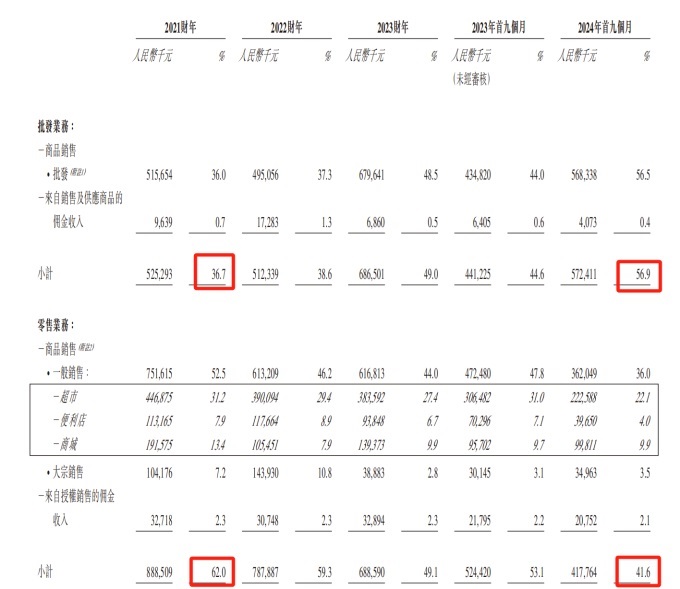 一种较为明显的趋势是,零售业务收入比例持续下降(从2021年的62%下降到2024年前9个月的41.6%)和批发业务的强势崛起(同期从36.7%上升到56.9%),反映出宏信超市面临着深刻的业务结构调整。