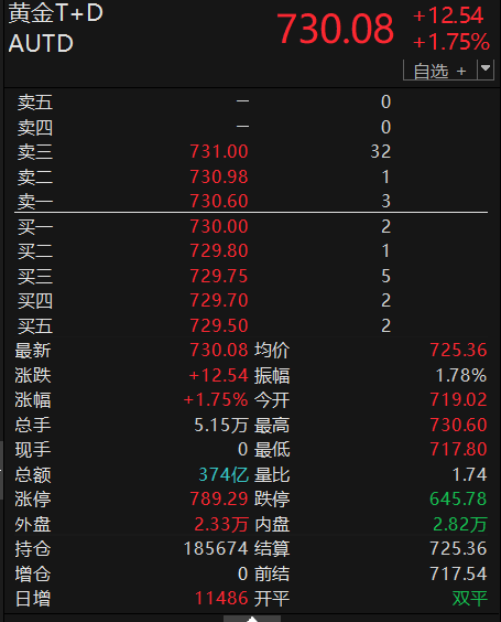 在国内,黄金T 截至下午,D盘中一度突破730元/克,收于1.75%,报730.08元/克。