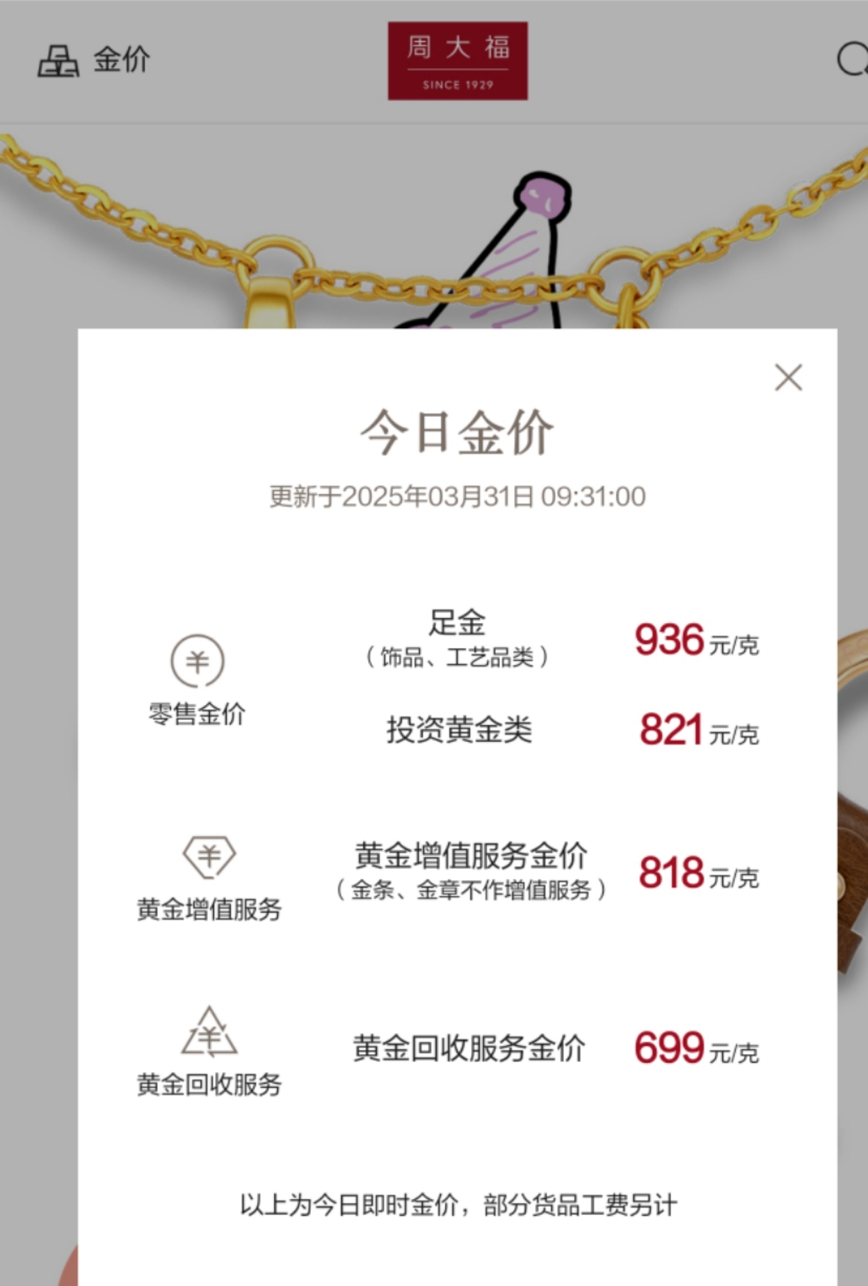 红星新闻记者在市场上了解到,随着黄金价格的上涨,黄金首饰价格进一步上涨。其中,周大福金店首饰价格调整为936元/克(下图)。六福金店首饰价格也调整为934元/克,首饰价格接近1000元心理线。