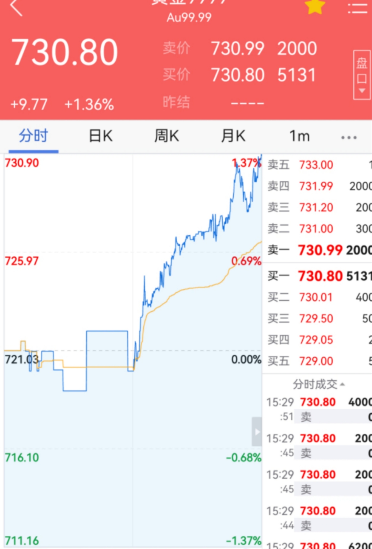 3月31日,上海黄金交易所黄金9999种类型也随之上涨至730.8元/克,全天上涨1.36%(下图)。