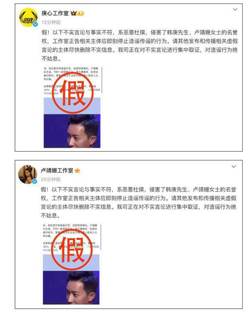 3 月 31 日本,韩庚与卢靖姗工作室联合发布严正声明,针对网络爆炸 "夫妇按收入比例分摊费用""三亚房产女方出资" 60% " 等待谣言反驳,强调相关言论 “与事实不符,是恶意杜撰”,并表示已经启动司法程序维护权益。u200b