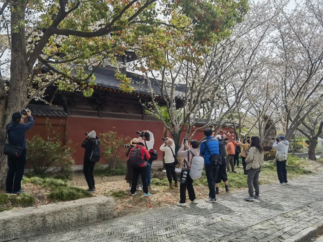 不仅是中小学生,公园里还有很多拿着长枪短枪的“大学生”在这里捕捉春天。经过咨询,记者了解到,佘山镇老年大学摄影班的这群“大学生”今天也特意来这里拍樱花。“老师带我们来训练拍摄。今天阳光刚刚好,不温不燥。”郭女士说。