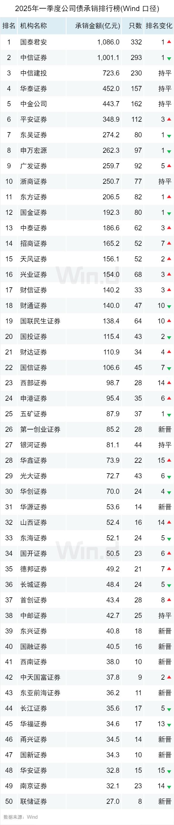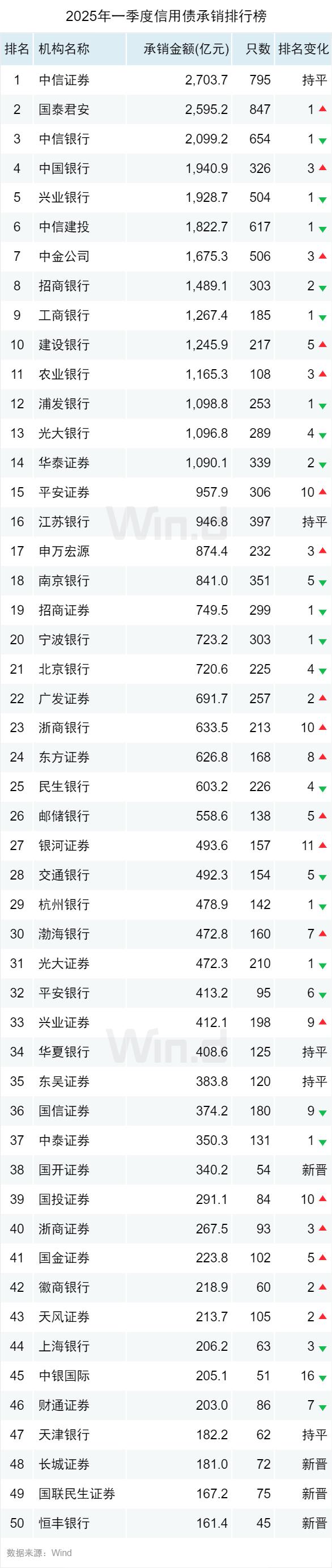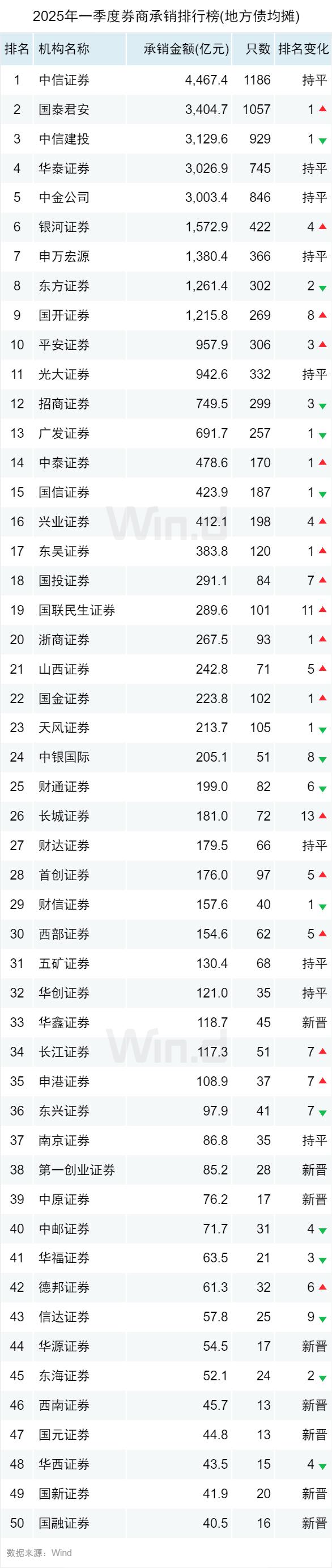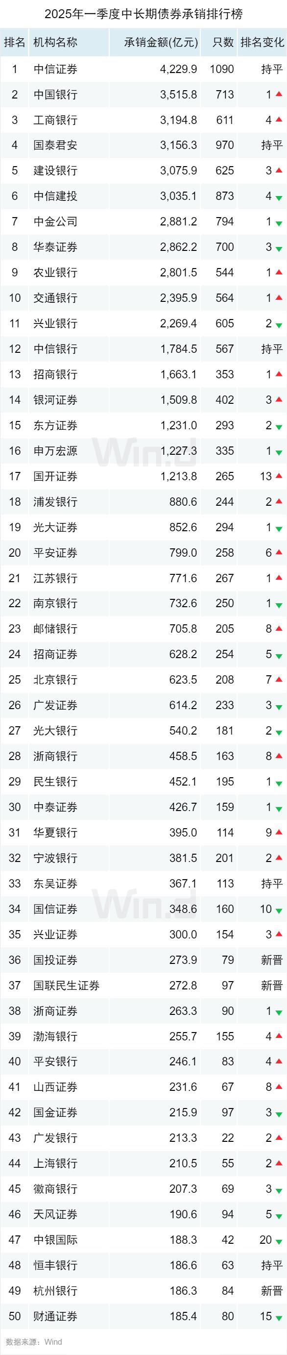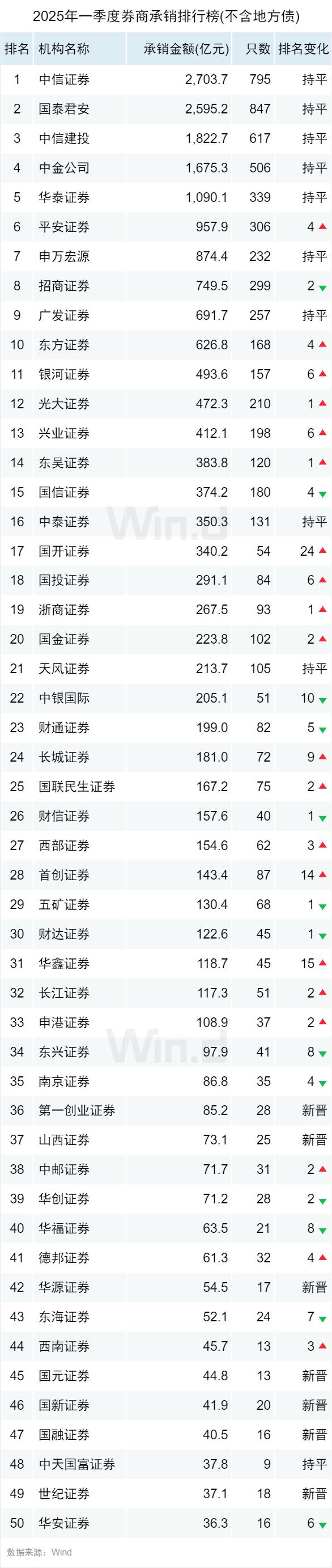 就债券承销而言 2025 每年第一季度各机构的表现如何,万得第一时间为您隆重揭幕。 2025 中国内地市场债券承销年度第一季度排名。