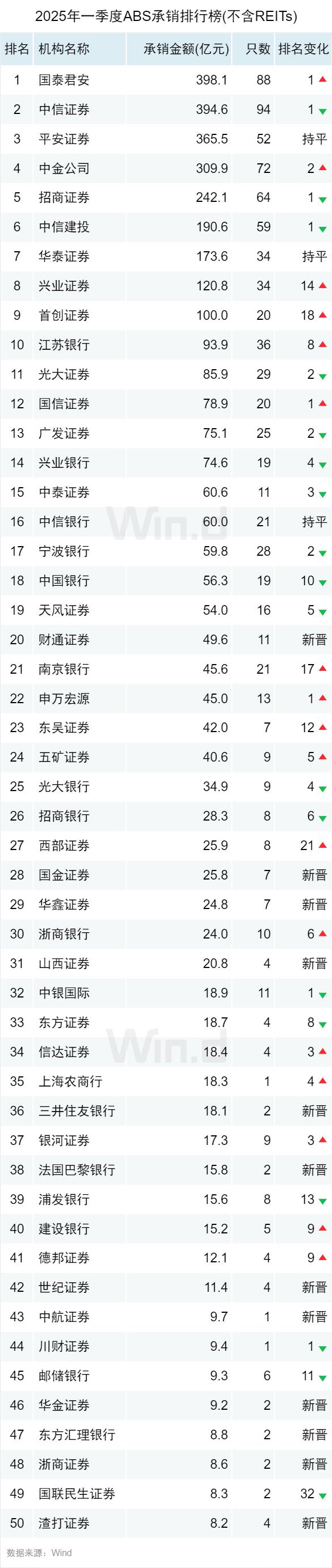 资产支持证券国泰君安包销金额 398.1 亿元排名第一,中信证券以亿元排名第一。 394.6 1亿元位居次席,平安证券以1亿元位居次席。 365.5 亿元排在第三位。