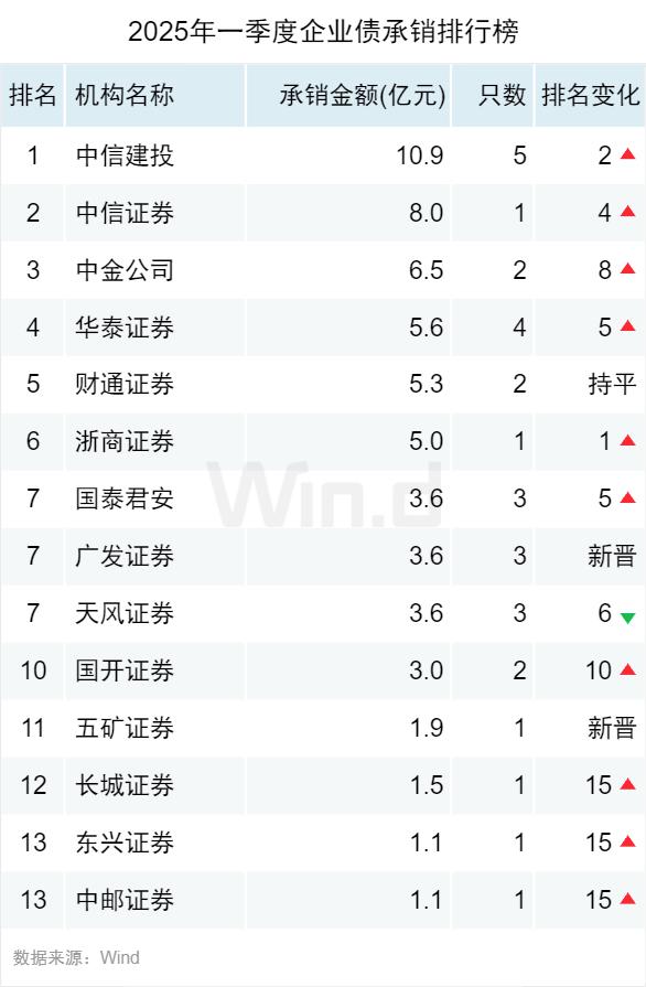中信建投在公司债务方面排名第一,2025年 年度第一季度包销 10.9 1亿元,中信证券、中金公司排名第二、第三,包销金额分别为 8.0 亿元和 6.5 亿元。