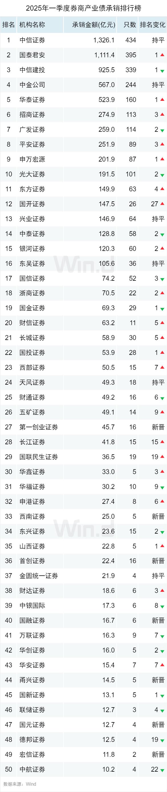 在券商包销行业债券方面,中信证券排名第一,包销金额 1,326.1 1亿元,国泰君安、中信建投排名第二、第三,包销金额分别为 1,111.4 亿元、925.5 亿元。
