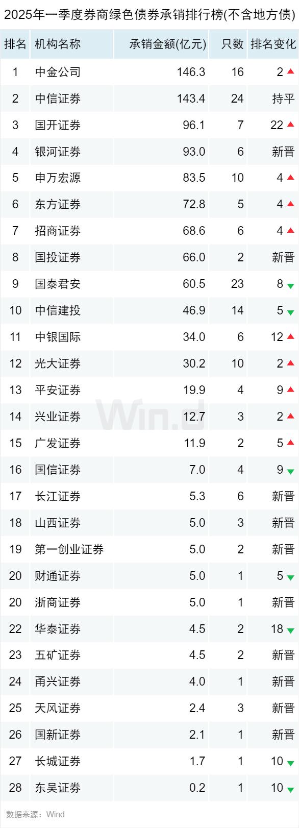 在券商包销绿色债券方面,CICC排名第一,包销金额 146.3 1亿元,中信证券、国开证券排名第二、第三,包销金额分别为 143.4 亿元、96.1 亿元。