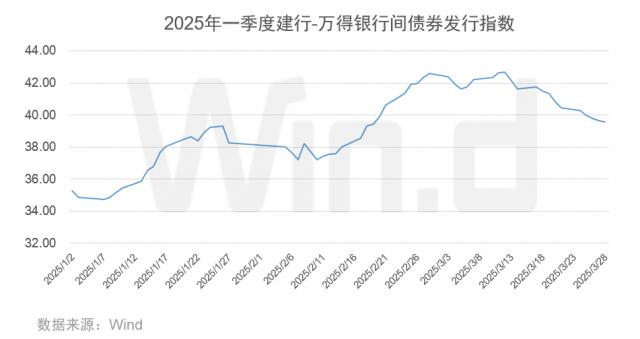 基于反映债券市场资金成本水平的“建行” - 根据万得银行间债券发行指数, 2025 2008年第一季度,整体发行成本呈上升趋势。该指数在新年伊始向上波动,直至 2 月中旬抵达 42 上下高位之后开始下滑,未来趋势还有待观察。