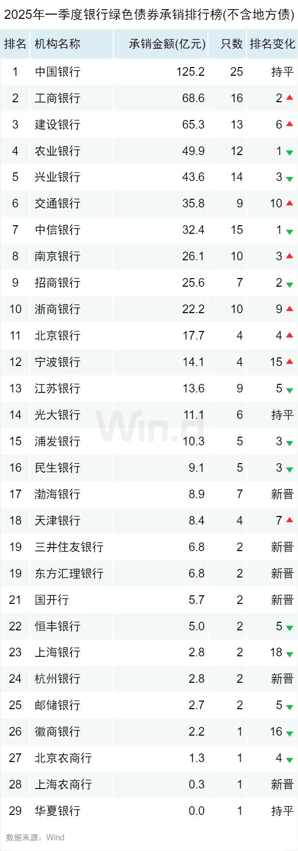 在银行包销绿色债券方面,中国银行排名第一,包销 125.2 1亿元,工商银行、建设银行排名第二、第三,包销金额分别为 68.6 亿元和 65.3 亿元。