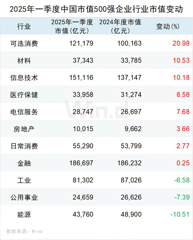 从市值 500 2025年,强企业行业市值变化, 年一季度有 8 个别行业市值增加,3 个别行业市值下降。其中,可选消费行业总市值增长 20.98%,达 121179 亿元;与信息技术板块相比,材料和信息技术板块的市值 2024 年分别增长 10.53% 和 10.18%;与工业板块相比,能源、公共事业和市值 2024 年各自降低 10.51%、7.39% 和 6.58%。