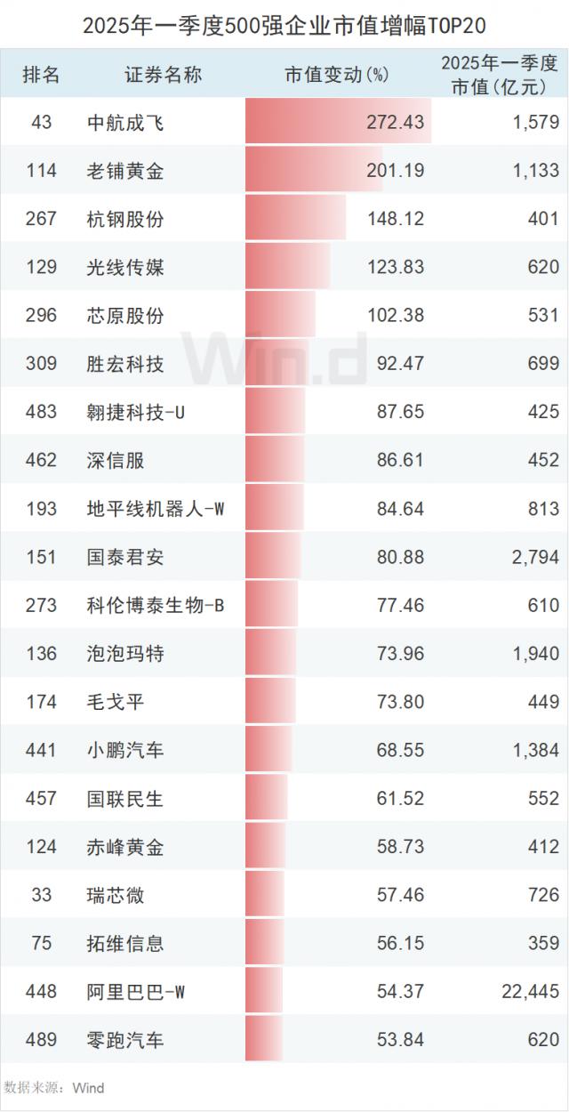 2025 年度大部分季度 500 强大的企业市值比较 2024 年增长明显。中航成飞市值增长 272.43%,排名第一;与公司市值相比,如老铺黄金、杭钢、光媒、芯原等。 2024 每年的增长都超过了 100%。