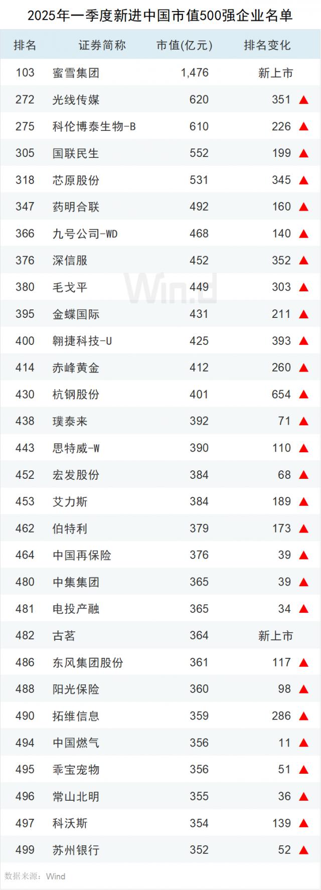 2025 年度一季度共有 30 家庭新面孔跻身市值 500 强,其中蜜雪集团、古茶为新上市公司,杭钢股份,翱捷科技 -U、深信,光传媒,核心股份,毛戈平等公司的市值排名第一。