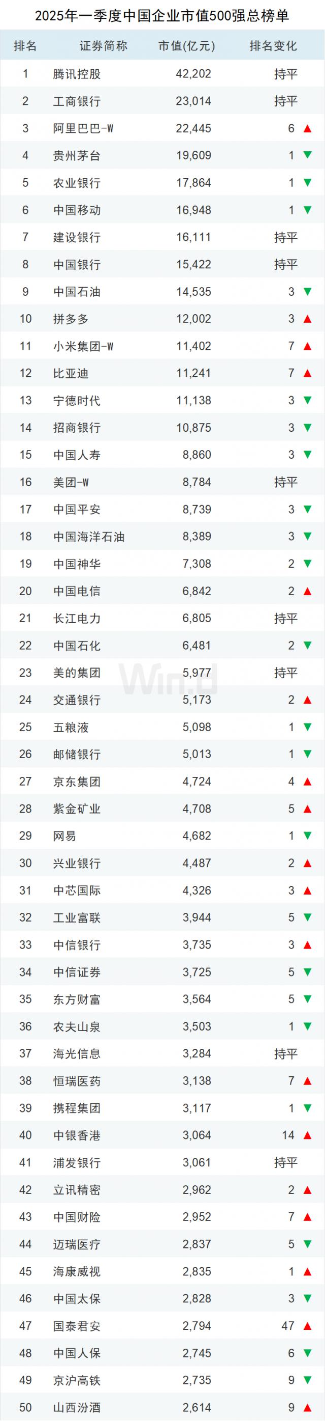Wind 最新发布 2025 中国上市公司年度第一季度市值 500 强势榜单,腾讯控股、工行、阿里巴巴位列市值榜前三。市值超过 1 企业有万亿元 14 家,较 2024 年末增加 4 家庭。阿里巴巴、拼多多、小米集团、比亚迪在市值超万亿企业中排名有所提升。
