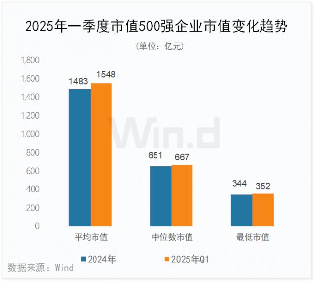 2025 每年第一季度市值 500 强势企业平均市值、中位数市值和最低市值分别是 1548 亿元、667 亿元和 352 亿元,较 2024 年分别增长 65 亿元、16 亿元和 8 亿元。
