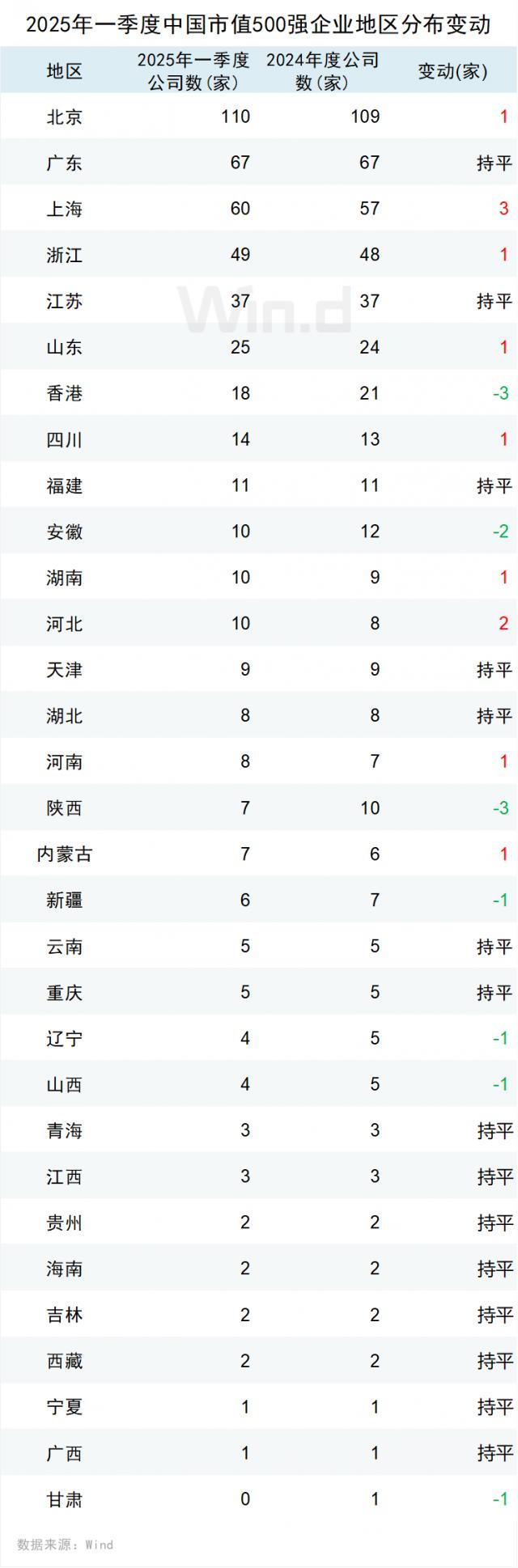 从市值 500 从强企业注册地分布来看,2025 北京、广东、上海年一季度位列前三,分别位列前三, 110 家、67 家 60 家庭,其中,北京的增长 1 家,广东持平,上海增加。 3 家。