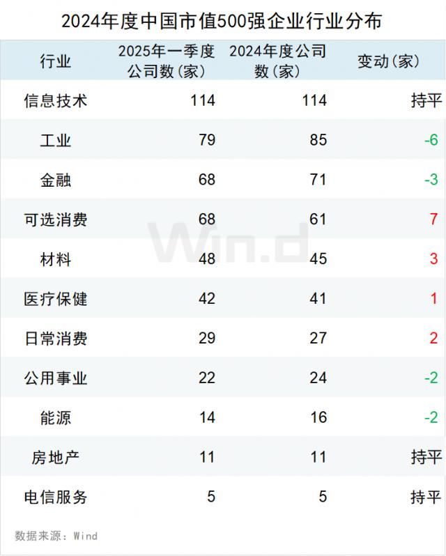 2025 每年第一季度从市值开始 500 根据强企业行业公司数量排名,其中,信息技术板块 500 强大的企业数量为 114 家,相比 2024 年度持平;工业企业数量为 79 家,相比 2024 年降低 6 家庭;金融板块企业数量为 68 家,相比 2024 年降低 3 家。