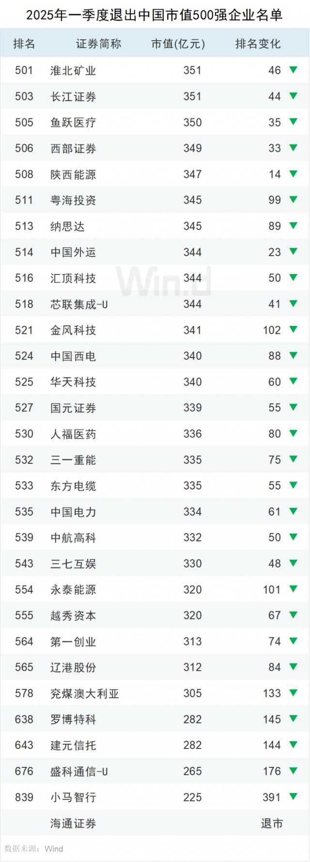 2025 年度一季度共有 30 企业退出市值 500 强大的团队,行业风向的变化,股票的下跌,导致部分企业市值迅速萎缩。