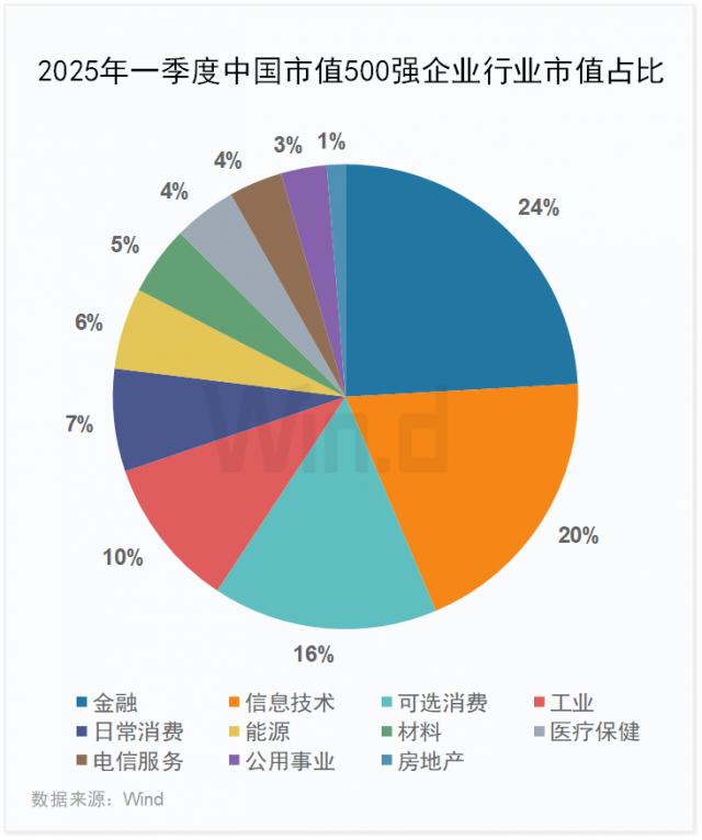 2025 每年第一季度市值 500 前三名企业的市值分别为金融、信息技术和可选消费,金融业的市值占比最高,达到最高水平。 24%。
