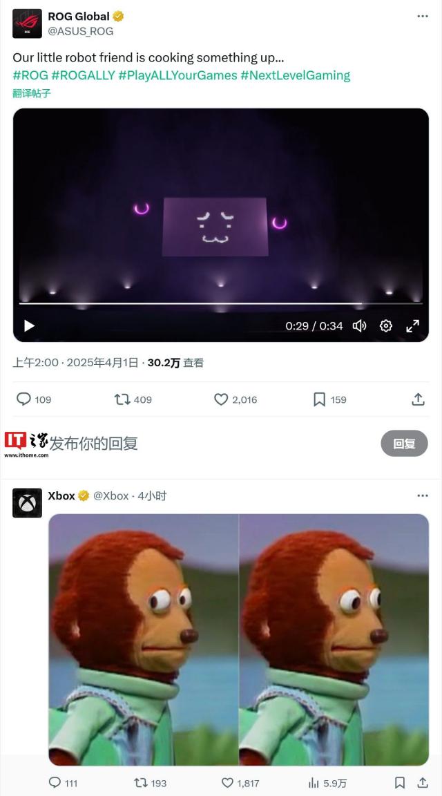 IT 世家 4 月 1 每日新闻,华硕 ROG 今天玩家国家官方帐户在今天? X 新型平台预热 ROG Ally 微软手持设备系列,值得注意。 Xbox 官方还在这种动态下进行了玩梗式回应,估计新机器就是之前传闻中的双方合作款。 Project Kennan。