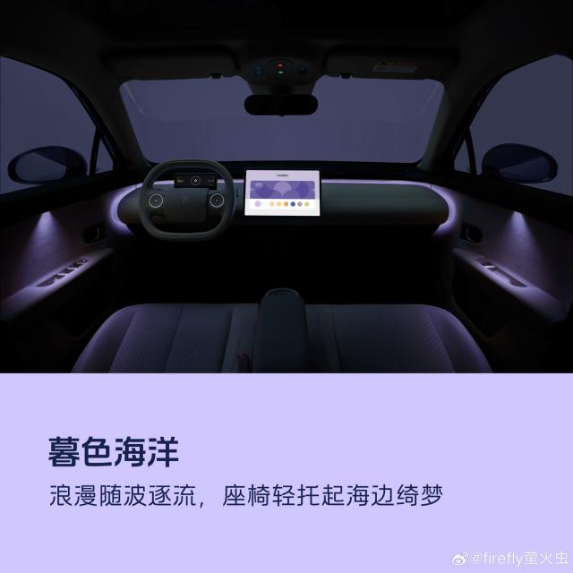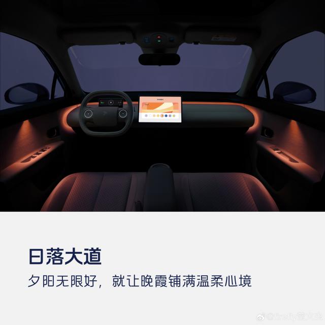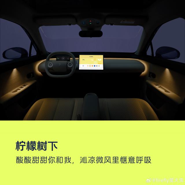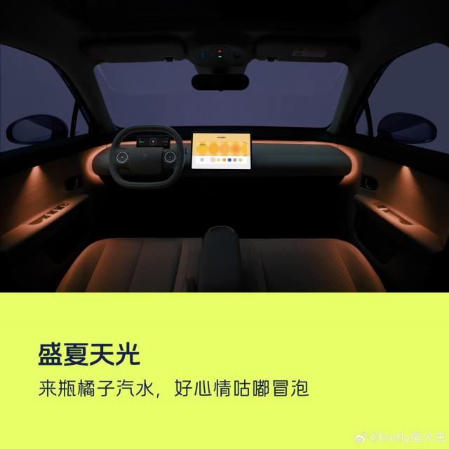 这次官方主要宣传了新车内饰的主题色彩:柠檬树下(黄色)、日落大路(橙红色系)、夏天的光(橙色系)、云航(白色系)、暮色海洋(紫色系)、午夜蓝调(蓝色系)、霓虹舞厅(紫红色) 绿色系)、莹光派对(淡紫色) 黄色系)。