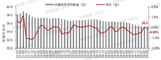 图:2021 年7月至 2025 年 3 月 50 城市住宅的平均租金和环比变化