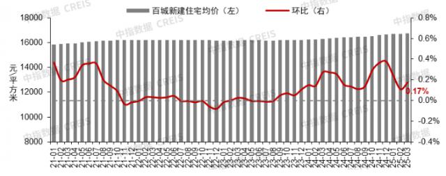 图:2021 年 1 月至 2025 年 3 月百城新建住宅价格及环比变化