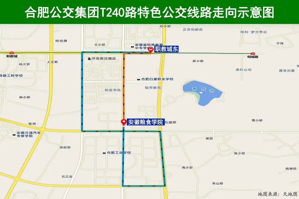 T240路特色公交站点:安徽粮食学院、职业教育城东;回程时,T240路特色公交停靠职业教育城东、合肥工业学校、合肥经贸旅游学校、中井路口、烈井路口、安徽粮食学院。