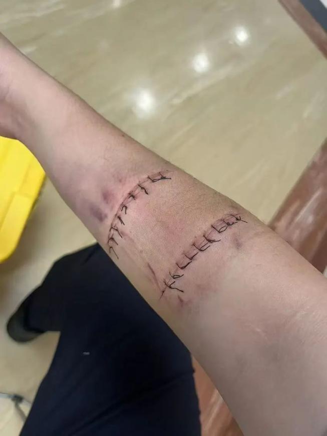 他对女儿说:“这是爸爸的徽章,不疼!”