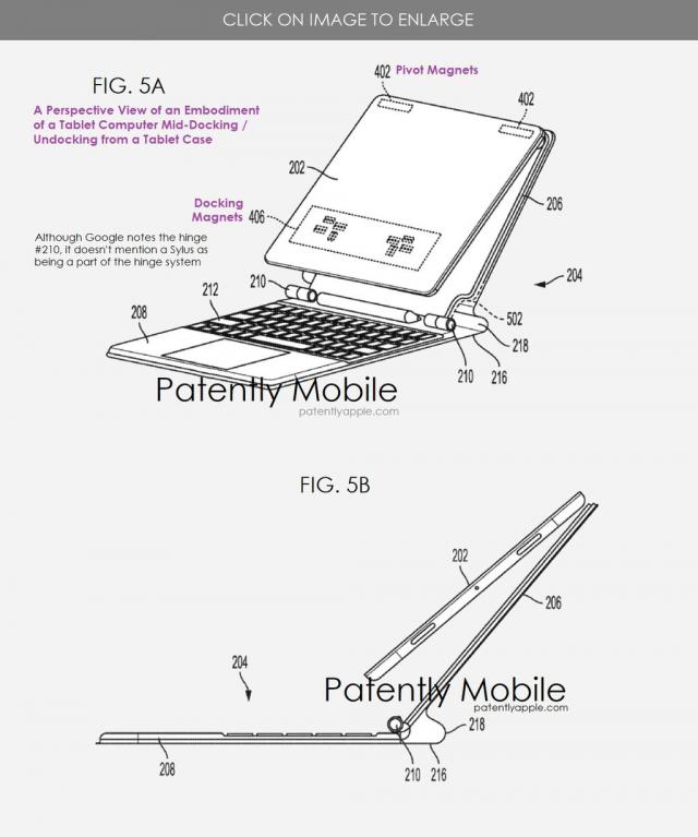 IT 世家注:Pixel 现在平板配有音响 / 充电底座,定位家居场景,最新专利谷歌正在开发带键盘和触摸板的保护壳,采用磁性铰链结构实现分步拆卸:当主磁性阵型固定机身时,枢轴磁体仍然保持连接,以确保旋转和调整。